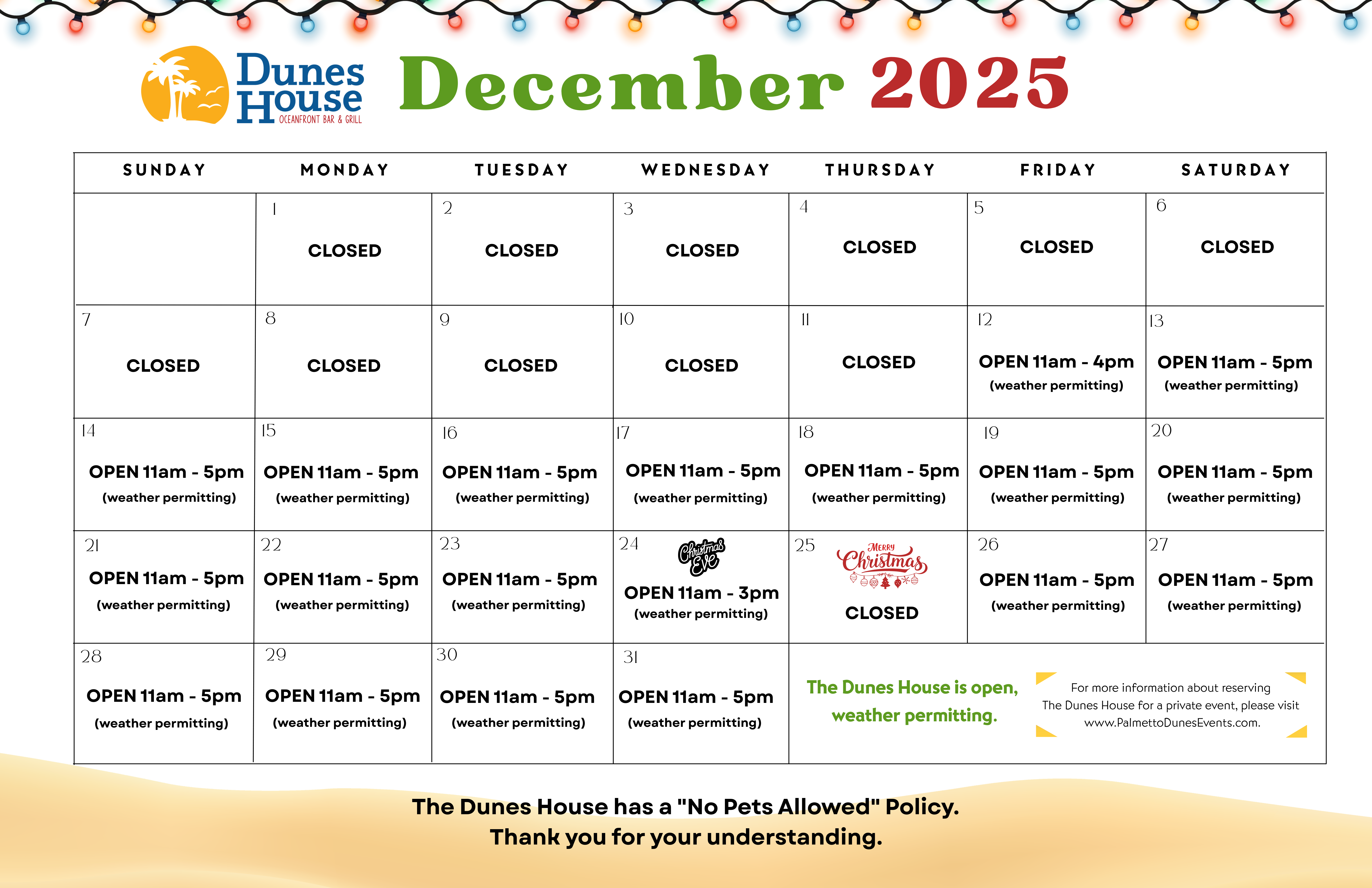 The Dunes House is also available year-round for private celebrations, including family reunions, weddings, holiday parties, and birthday parties. To book a special event at the Dunes House, please contact our Catering and Events Manager.